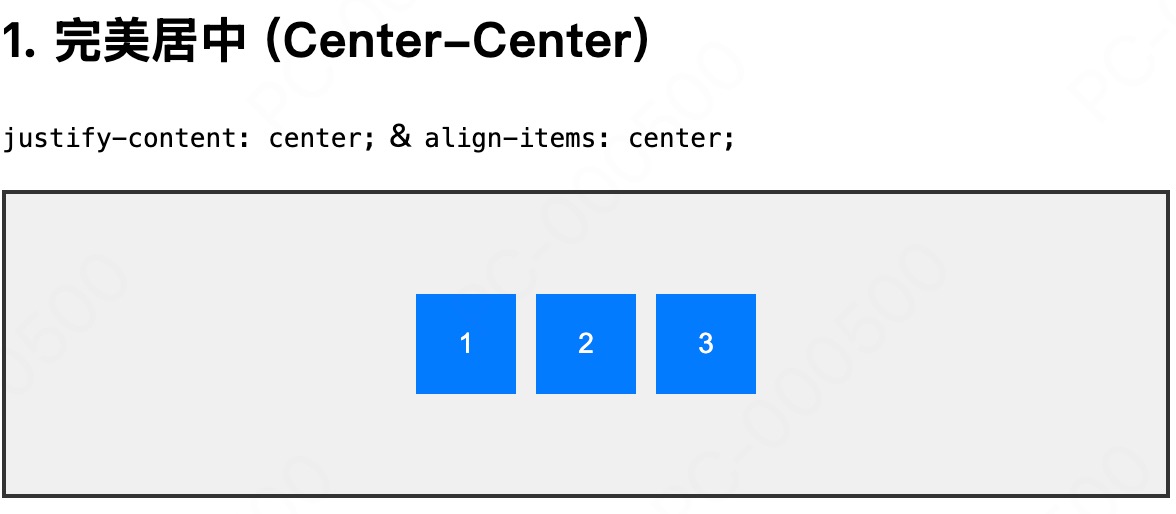 下面的示例,展示了 justify-content 和 align-items 属性不同组合下的布局效果: