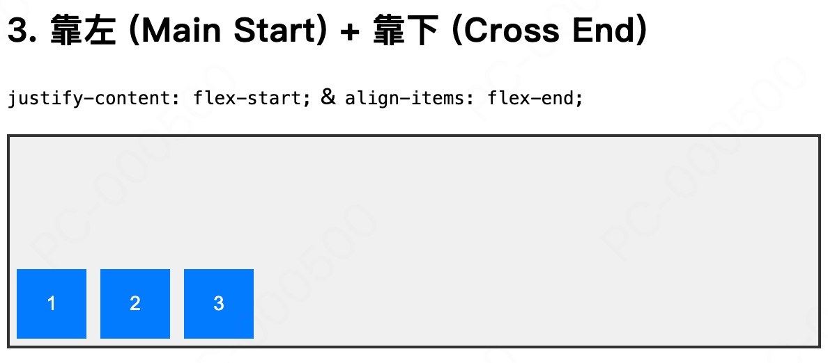 flex-start(默认):靠主轴起点对齐 (Main Start),项目都集中在主轴的起始端