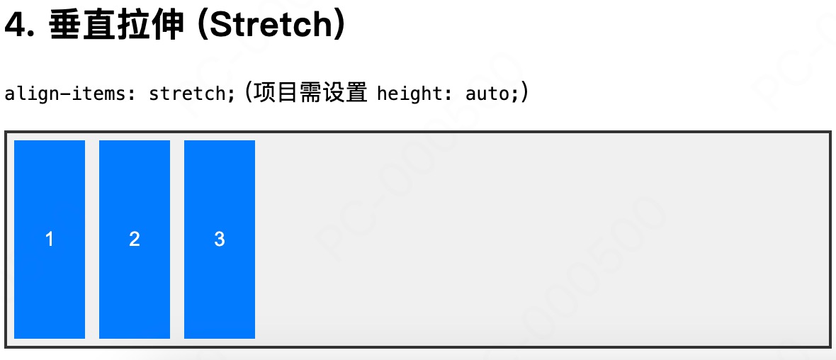 auto,项目将拉伸至占满容器的整个交叉轴高度(长度) - flex-start:靠交叉轴起点(Cross Start)对齐