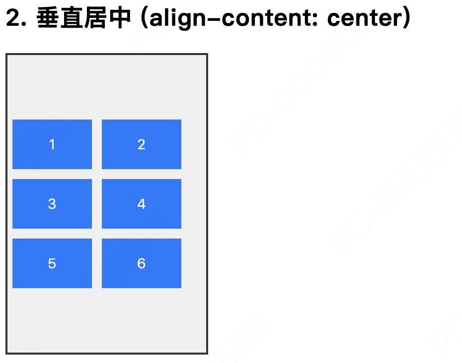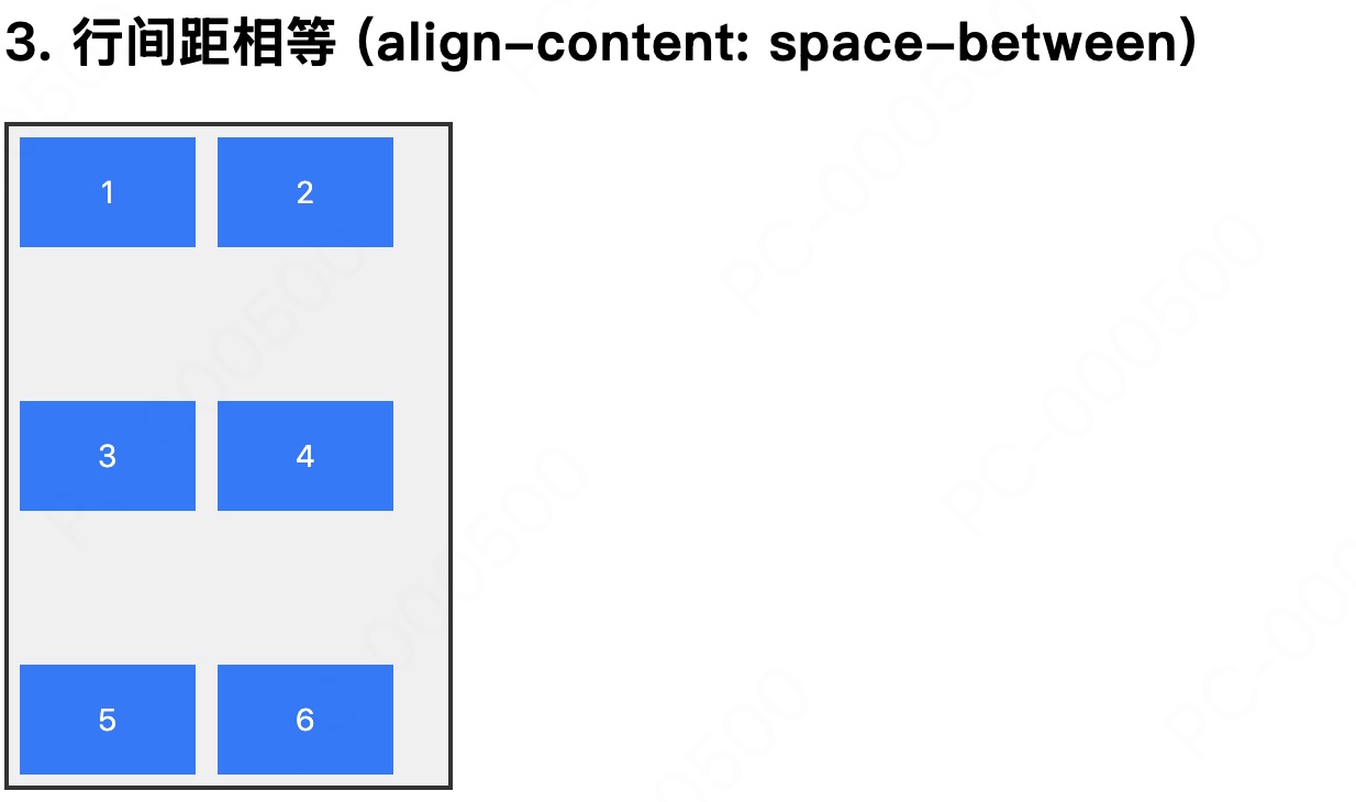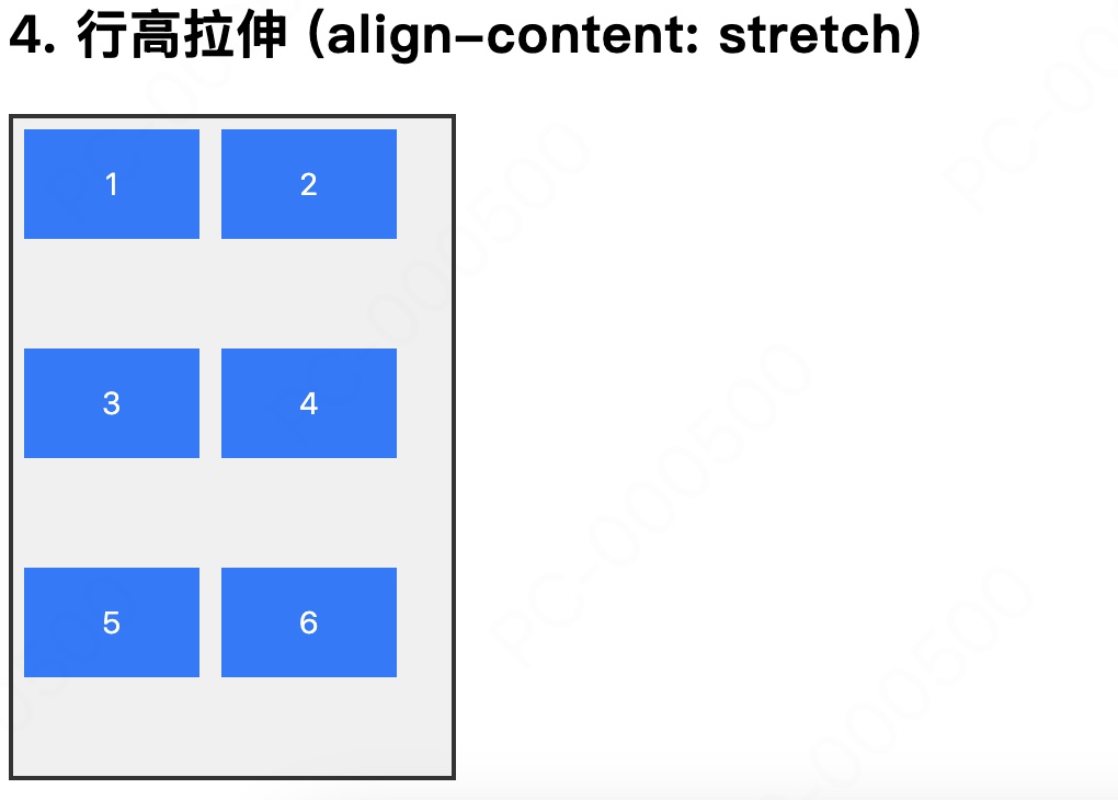align-content 属性则专门用于处理 多行 (Multi-line) Flex 布局,用于控制多根轴线在交叉轴方向上整体的对齐和空间分布。例如当 flex-direction: row(主轴水平)时,align-content 控制的是多行项目在垂直方向上的分布: