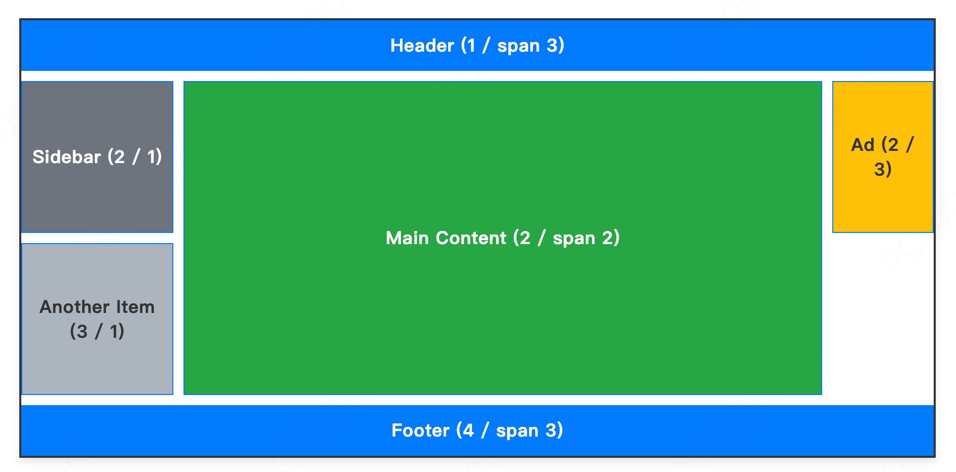 1 | grid-template-areas: "header header header" "sidebar main main"; |