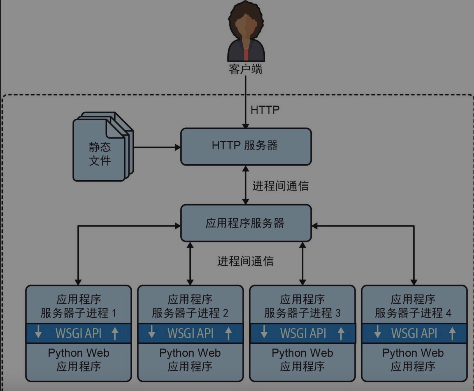 - 客户端连接 HTTP 服务器,后者负责分发静态文件,并把其他请求转发给应用服务器