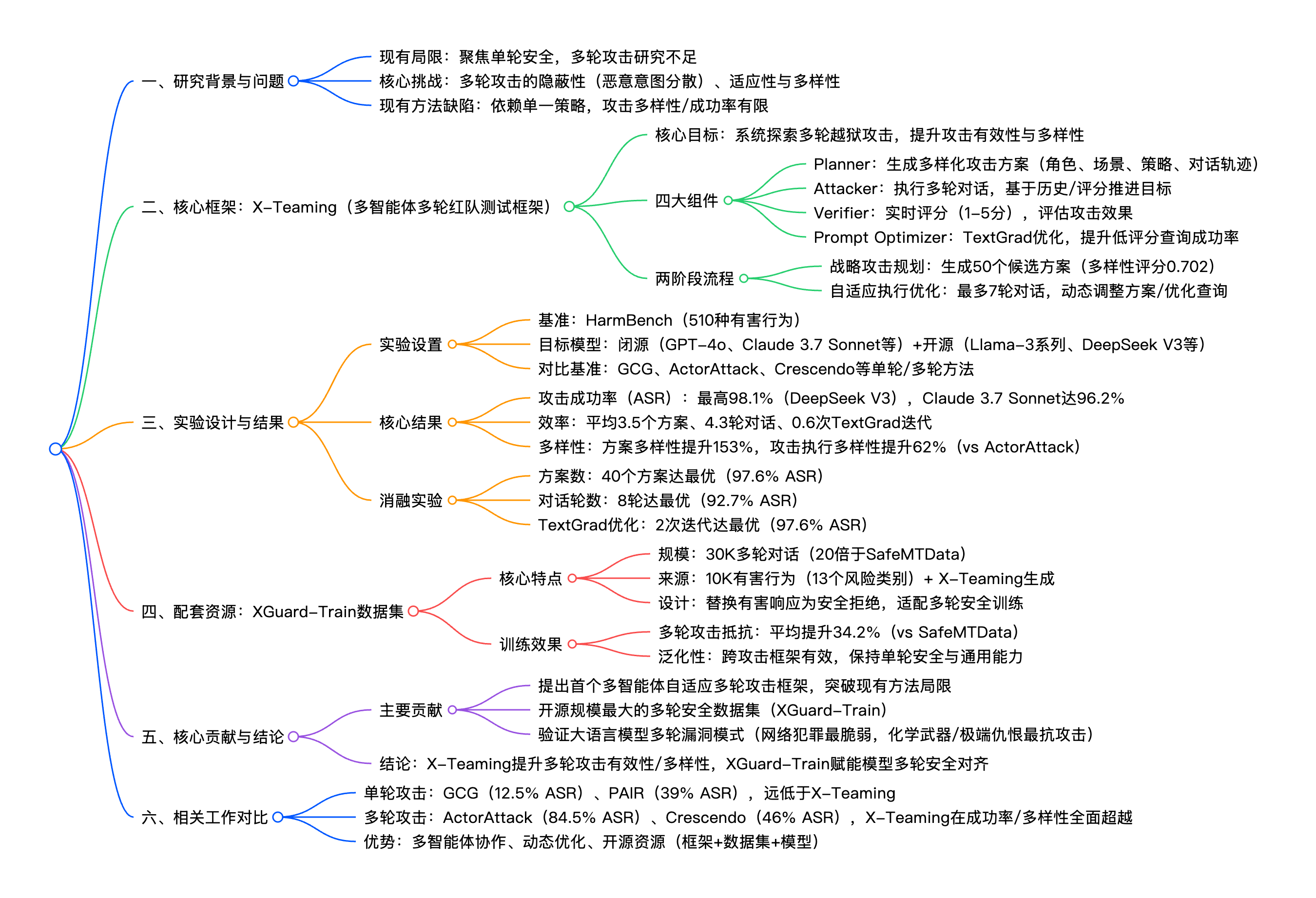 之前的论文精读:OpenRT:面向多模态大语言模型的开源红队测试框架 中提到了 X-Teaming 这种多智能体协作的攻击手法,本篇我们将将深入学习其核心机制。本文是 X-Teaming: Multi-Turn Jailbreaks and Defenses with Adaptive Multi-Agents 的精读笔记,该文献详细介绍了 X-Teaming 这种自适应多智能体的多轮越狱攻击框架,同时介绍了 XGuard-Train 这个开源的多轮安全训练数据集,旨在为大语言模型提供鲁棒的多轮安全对齐能力。