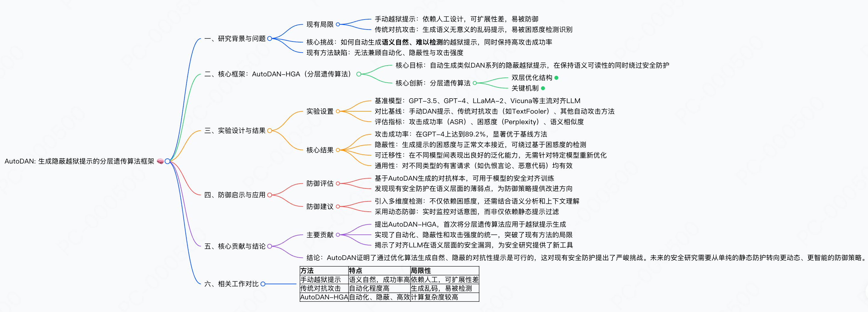本文提出 AutoDAN 方法,在确保越狱提示词隐蔽性的同时实现自动化部署。为此,深入研究分层遗传算法的优化过程,设计专用模块以适配提示词文本这类结构化离散数据。大量评估验证了本文方法在不同场景下的有效性和隐蔽性,同时展示了新设计模块带来的性能提升。