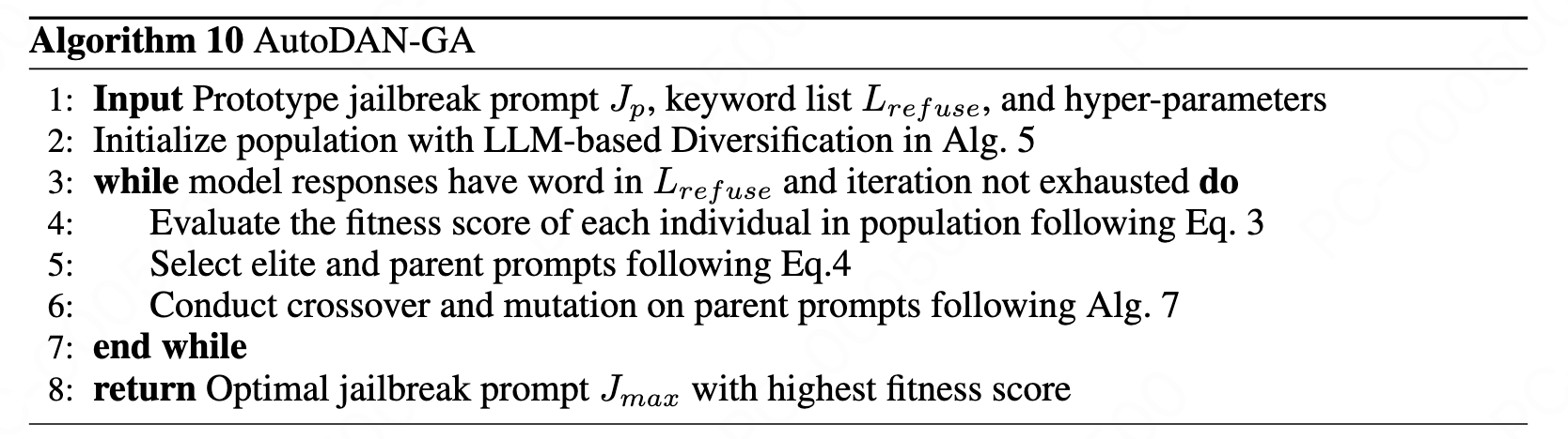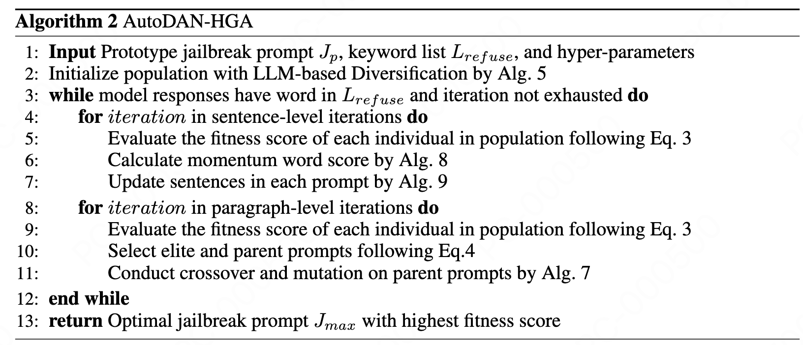 为了确保 AutoDAN 的有效性和效率,我们采用了结合最大迭代次数测试与拒绝信号测试的终止准则。如果算法已耗尽最大迭代次数,或者在语言模型(LLM)回复的前 个词中未检测到预设列表 (拒绝词列表)中的任何关键词,AutoDAN 将终止运行,并返回当前具有最高适应度评分的最优越狱提示词。最后,AutoDAN-HGA 的完整流程已在算法 2 中描绘。