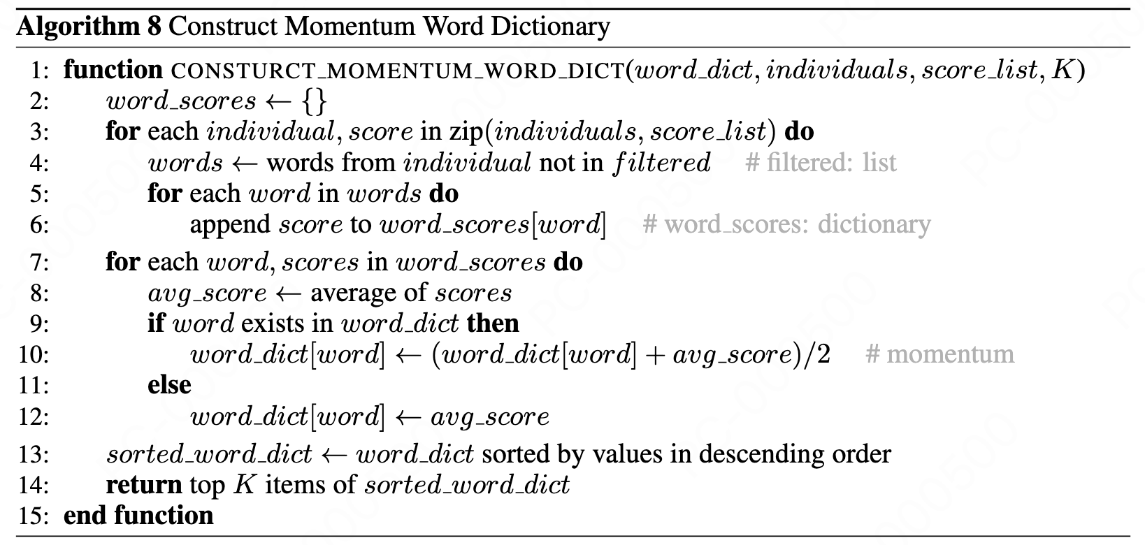 - 为了进一步解决优化过程中适应度评分可能存在的不稳定性,我们在单词评分中引入了**基于动量(Momentum-based)**的设计。即:根据当前迭代的平均分与上一次迭代平均分的加权结果,来决定一个单词的最终适应度评分。