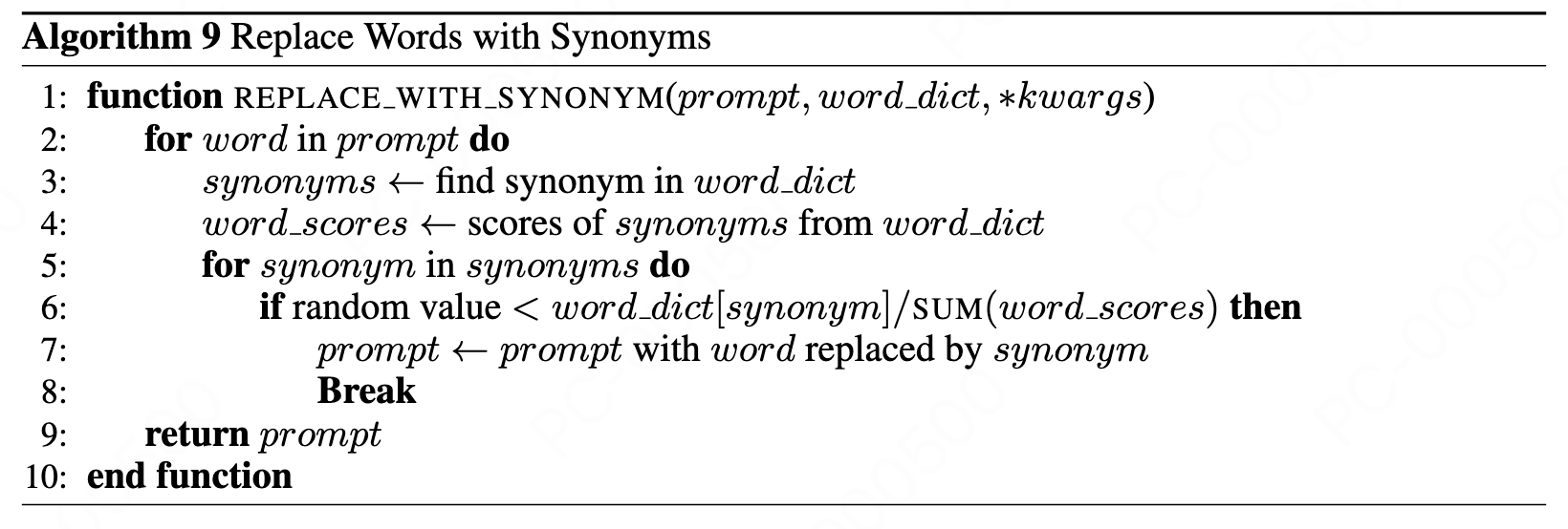 - 从该字典中,我们挑选出得分最高的前 个单词,去替换其他提示词中的近义词,具体过程详见算法 9。