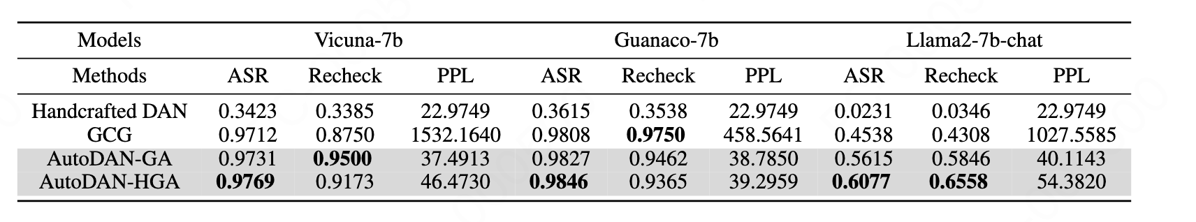 - 提出 AutoDAN:这是一种针对大语言模型(LLMs)的新颖、高效且具隐蔽性的越狱攻击方法。我们将隐蔽越狱攻击概念化为一个优化过程,并提出了一种基于遗传算法的方法来求解该优化过程